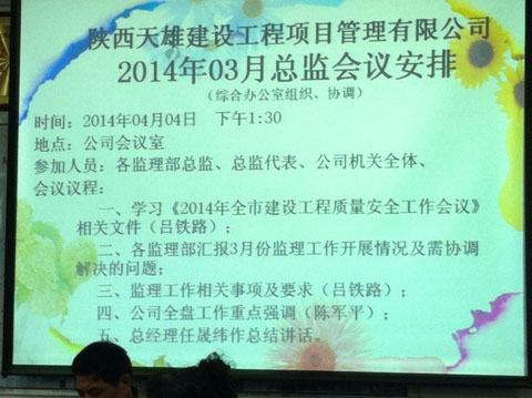 2014.4.5日下午1:30,在公司会议室召开了2014年度3月份总监例会,所有在建项目的总监及公司办公室全体人员参加了本次会议。